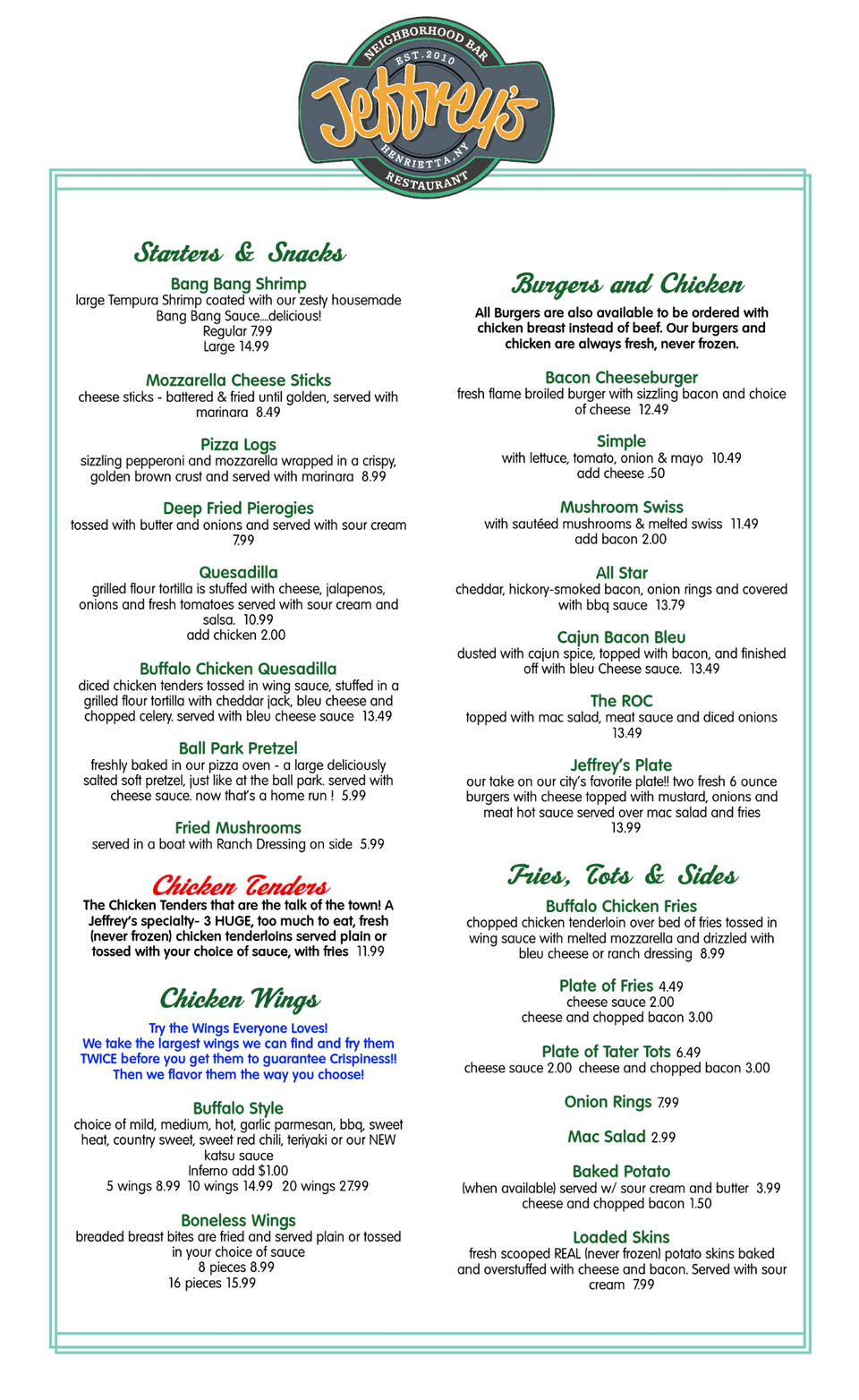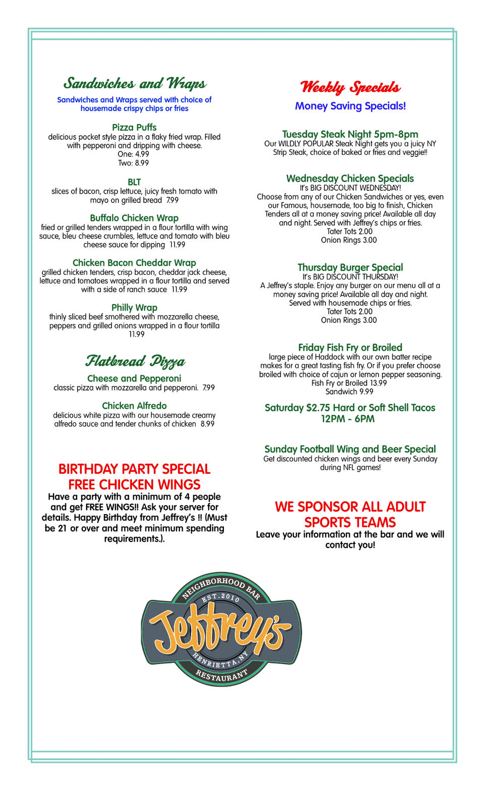 Just a couple easy rules...Since it's a Party Special, must spend a Minimum of $50 on beverages and/or other food items, and have a minimum of 4 people in your party. No doggie bags or To-Go. Valid ONLY on the day of your birthday unless your birthday falls on a day our kitchen is closed. If so, no problem..we will provide your FREE birthday wings on the WEDNESDAY after your Birthday. Have a HAPPY BIRTHDAY PARTY from Jeffrey's!!!